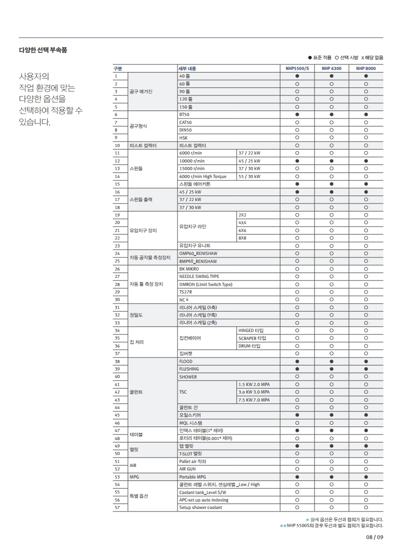NHP 시리즈는 고속 강력 절삭 능력과 동급 대비 최대의 가공 시방으로 생산성을 크게 향상시킨 장비입니다 . 스텝 가이드 웨이의 일체형 베드 구조로 강성을 높였으며 , 고속 급속이송으로 탁월한 생산능력을 갖추도록 설계 했습니다 . 또한 고객의 사용에 편리하도록 다양한 편의기능이 적용 되었습니다 .